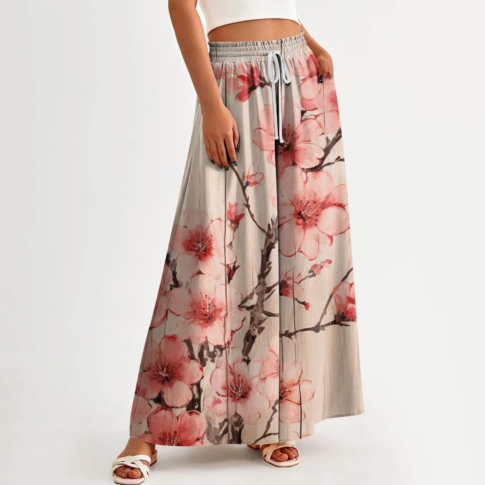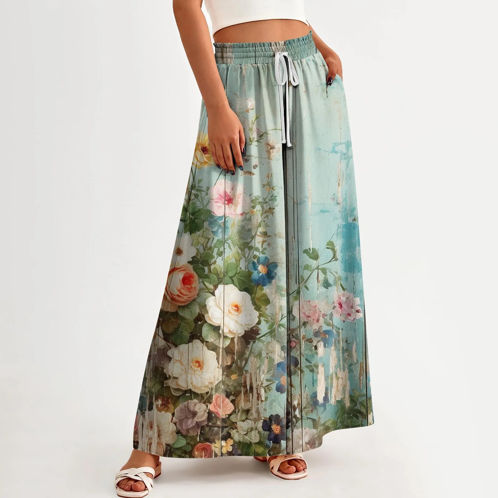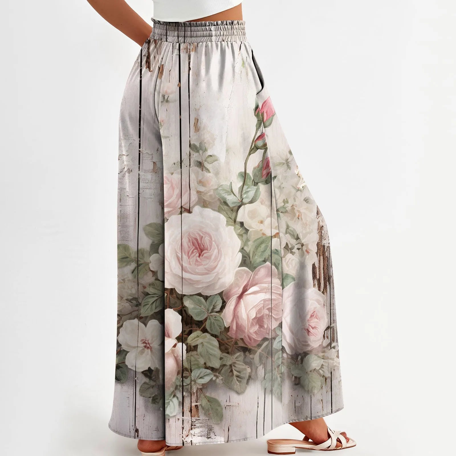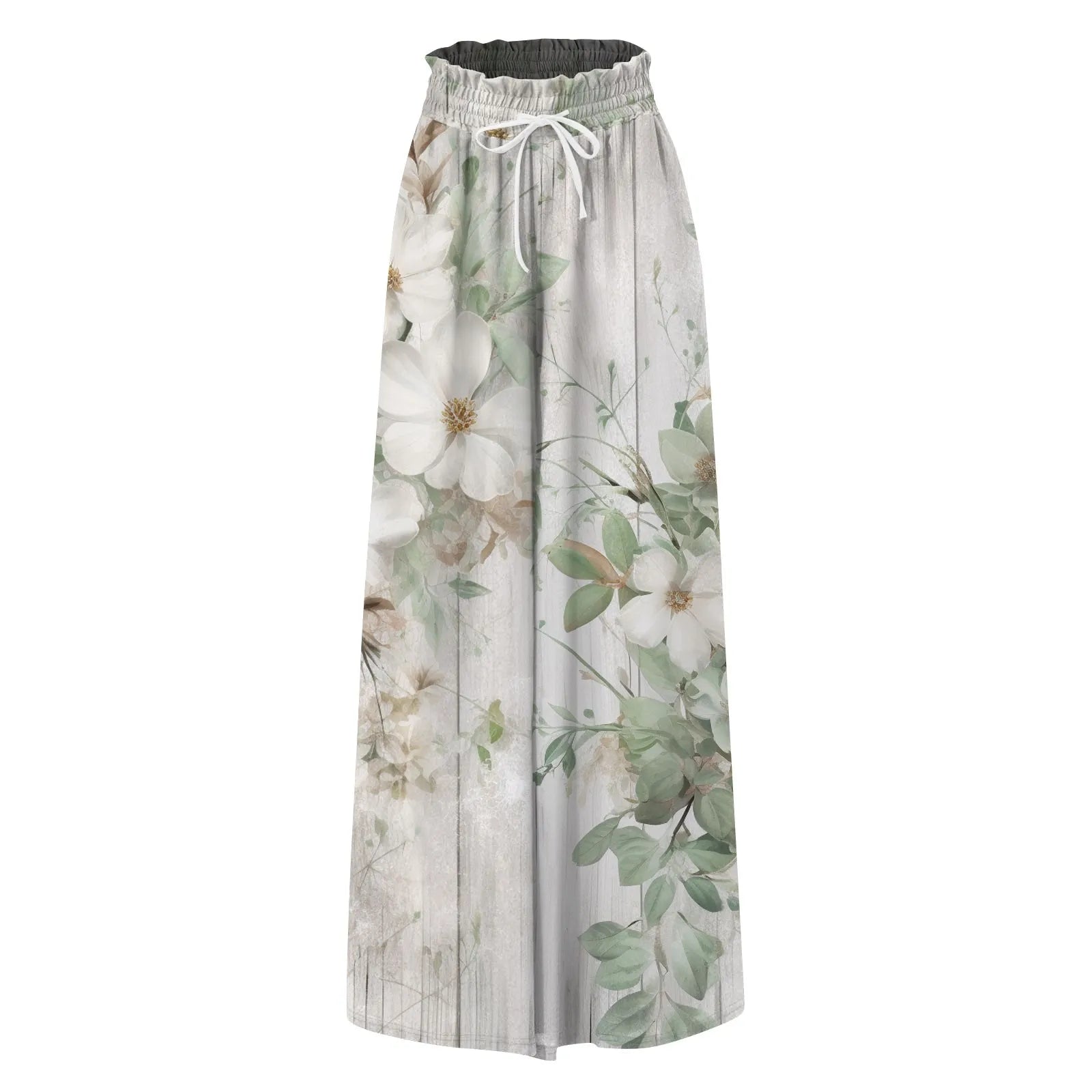 Whispers of wildflower skies meet soft, sweeping drapes. These wide-leg pants are cut from light, breathable cotton-poly with a gathered high waist and painterly floral print that flows like watercolor in motion.